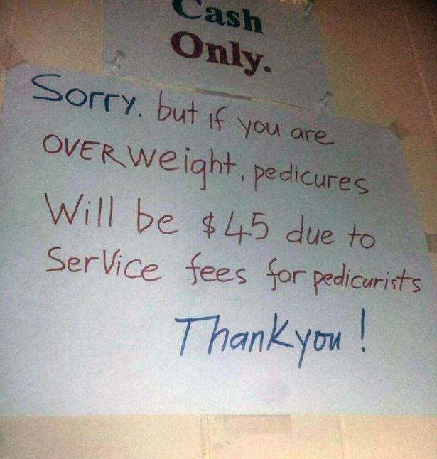 Egy Tennessee-ben található szépségszalon falán áll a felirat, miszerint sajnálják, de ha a vendég túlsúlyos, akkor a pedikűr 45 dollár, mely tartalmazza a felárat a dolgozók számára – írja a Bors Online.