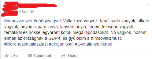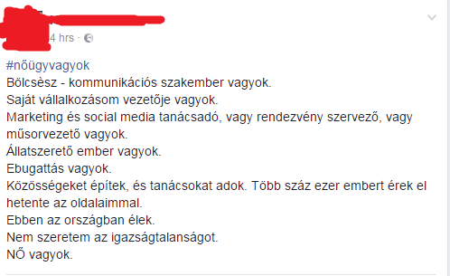 “32 éve vagyok anya, vállalkozó, nőjogi aktivista, író. Hol feleség, hol szingli, de mindig elkötelezett liberális. A gyermekeimet elfogadásra és önnállóságra neveltem. Nem vagyok alattvaló, nem vagyok másodrendű állampolgár. #nőügyvagyok“