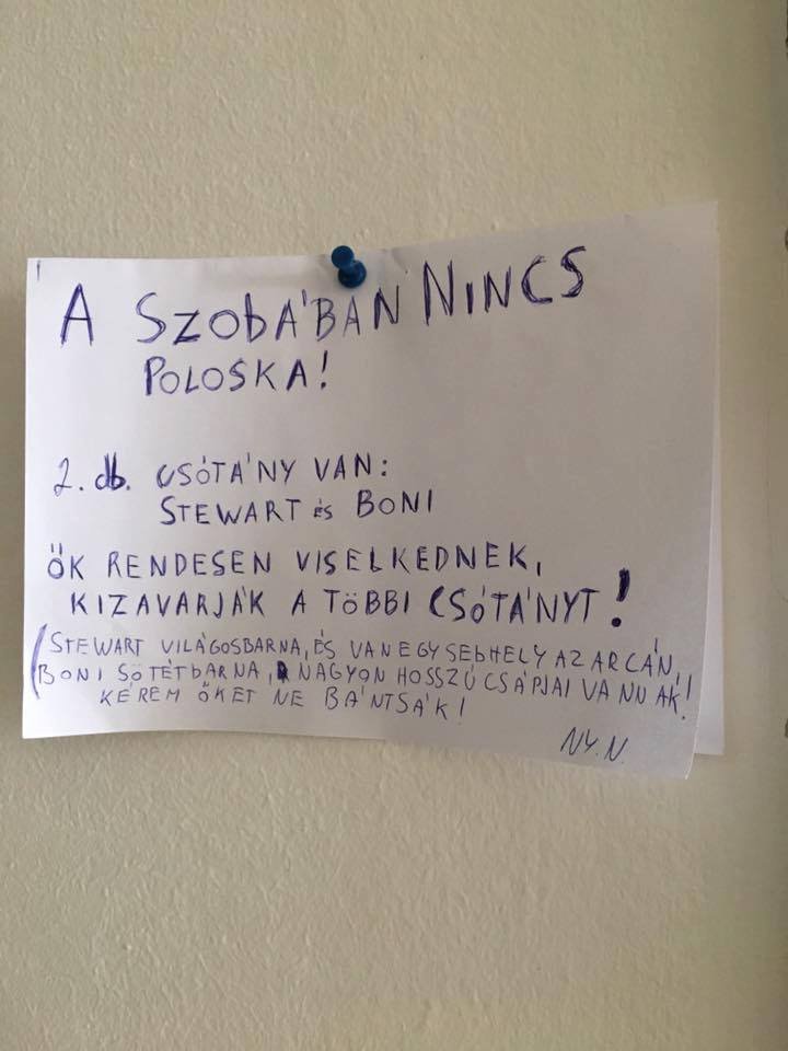 „A szobában nincs poloska! Két darab csótány van: Stewart és Boni. Ők rendesen viselkednek, kizavarják a többi csótányt! Stewart világosbarna és van egy sebhely az arcán, Boni sötétbarna, nagyon hosszú csápjai vannak. Kérem, őket ne bántsák!” – olvasható a cetlin.