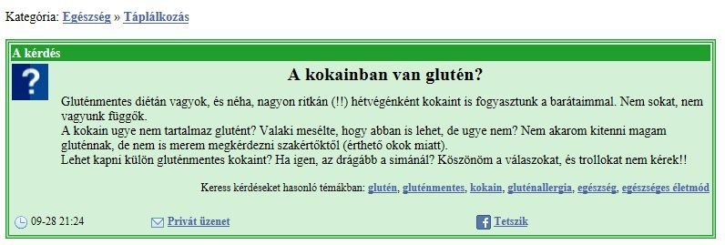 Nemrégiben napvilágot látott a gyakorikérdések.hu-n egy kérdés, miszerint a kokain gluténmentes-e: a kérdést feltevő amiatt aggódott, árthat-e az egészséges étrendjének a néhány hetente elfogyasztott kokain.